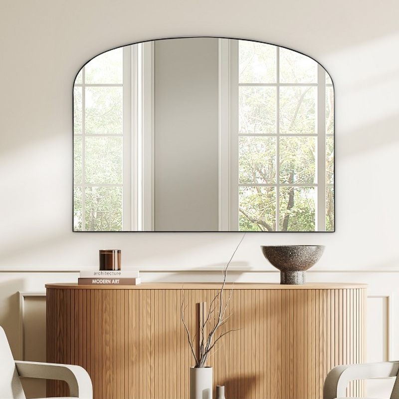 מראה מרהיבה בעיצוב מודרני ונקי, עם חלק עליון מעוגל המשווה לחלל תחושת רכות ואלגנטיות. המסגרת הדקה בגוון שחור מט מעניקה למראה מראה יוקרתי ומינימליסטי, ומתאימה בקלות לכל סגנון עיצוב – מודרני, אורבני, סקנדינבי או קלאסי.