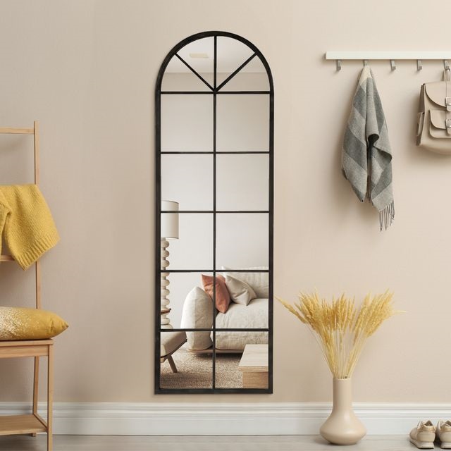 מראה אלגנטית ומרשימה בעיצוב חצי מעוגל, המשלבת מסגרת ברזל שחורה עם חלוקה גאומטרית ל־12 חלקים בסגנון “חלון תעשייתי”. המראה מוסיפה עומק, אור ותחושת מרחב לכל חלל – כניסה, סלון, חדר שינה או מסדרון.