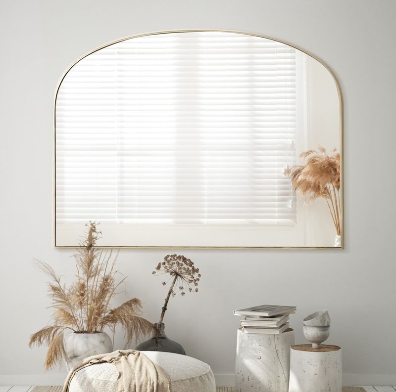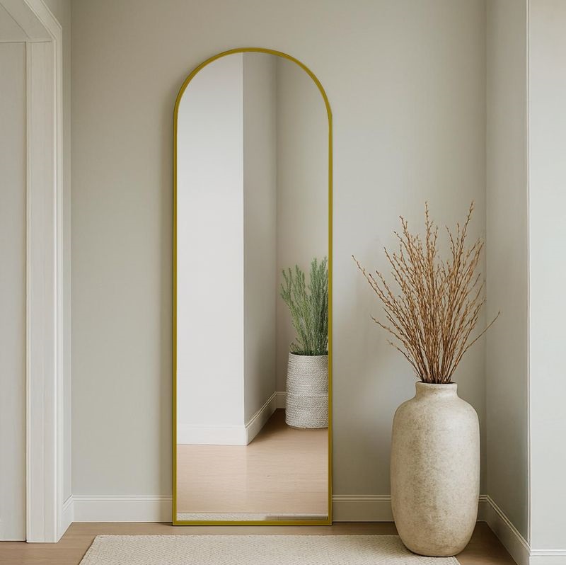 מראה אלגנטית ומודרנית בעיצוב חצי עגול ובמסגרת מתכת בגימור זהב מט – שילוב מושלם של יוקרה רגועה וקווים נקיים. הצורה המעוגלת בחלקה העליון מעניקה תחושת רכות וזרימה, בעוד המסגרת המוזהבת מוסיפה נגיעה של סטייל יוקרתי לכל חלל.