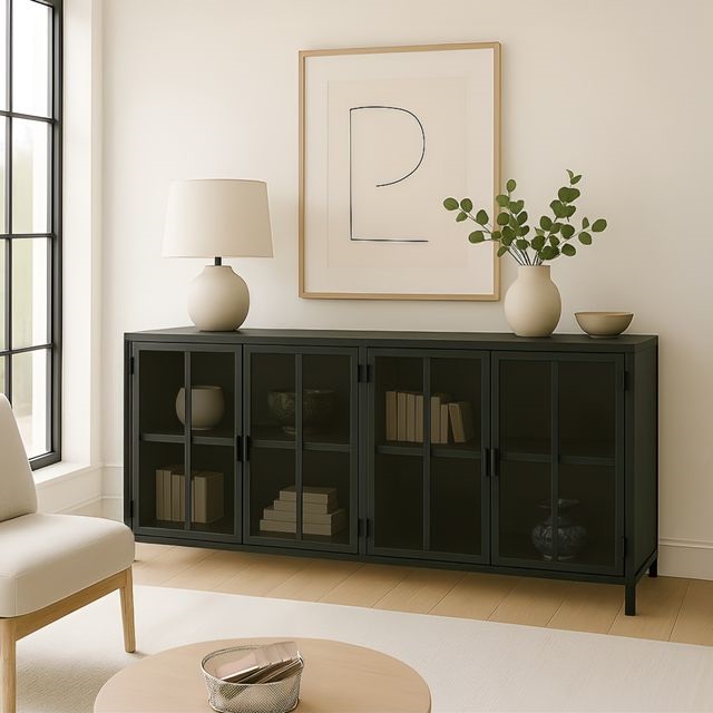 ויטרינה רחבה ומרשימה בעיצוב מודרני־נקי, עשויה מתכת שחורה איכותית בשילוב דלתות זכוכית שקופות המעניקות מראה יוקרתי, מאוזן ומלא סטייל. החלוקה הפנימית הרחבה מאפשרת אחסון מסודר והצגת פריטים דקורטיביים, ספרים, כלי אירוח ואוספים בצורה אסתטית ונגישה.