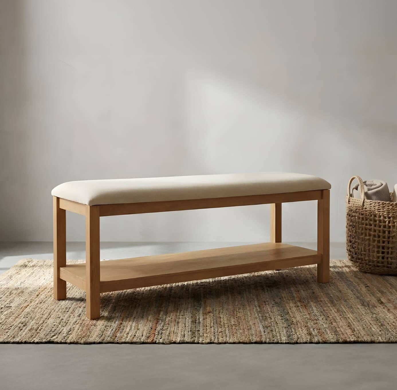ספסל עץ בעיצוב נקי ואלגנטי עם מושב מרופד בגוון בהיר, המשלב פונקציונליות ונוחות לצד מראה חמים וטבעי. הספסל מתאים במיוחד לכניסה לבית, לקצה מיטה, לחדר שינה או לסלון – כפריט ישיבה שימושי וגם כאלמנט עיצובי מרשים.