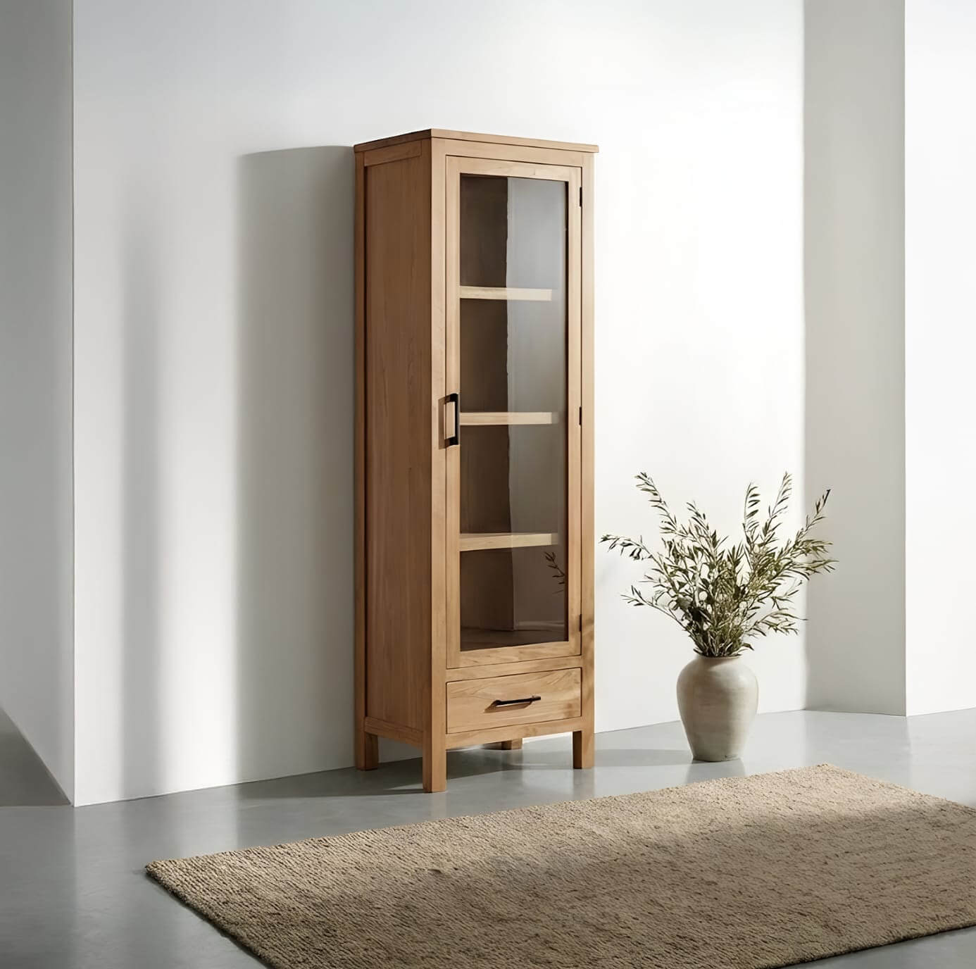 ויטרינה אלגנטית ומרשימה מעץ טבעי מלא, בעיצוב נקי ועל־זמני, המשלבת דלת זכוכית שקופה להצגת פריטי נוי, כלי הגשה או ספרים בצורה אסתטית ומוארת. העיצוב הצר והגבוה מאפשר ניצול חכם של חלל גם בחדרים קטנים, תוך שמירה על מראה אוורירי ויוקרתי.
