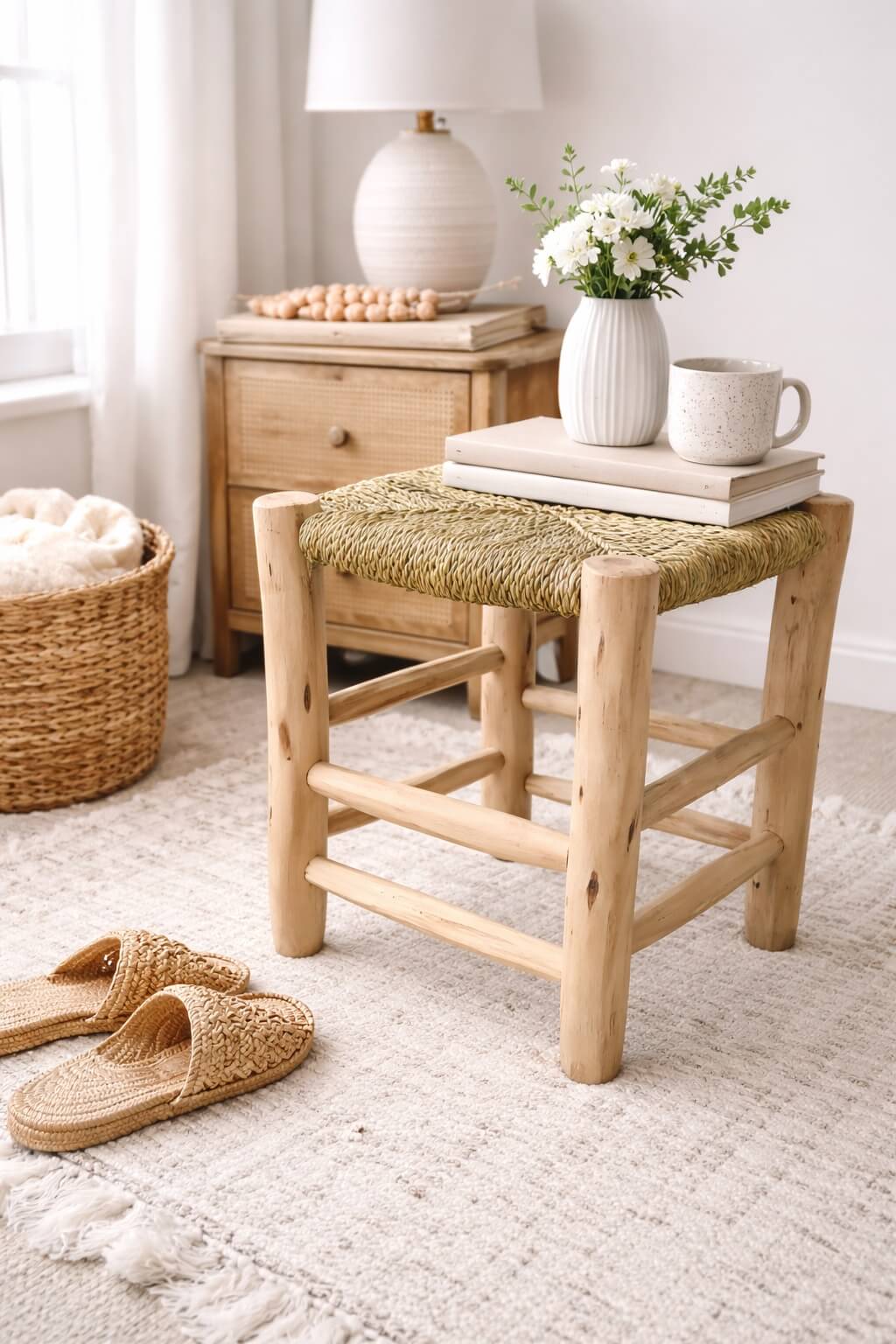 חומר: עץ טבעי עם מושב קש קלוע צבע: טבעי שימושים: ישיבה | הדום | דקורציה | פריט משלים לבית