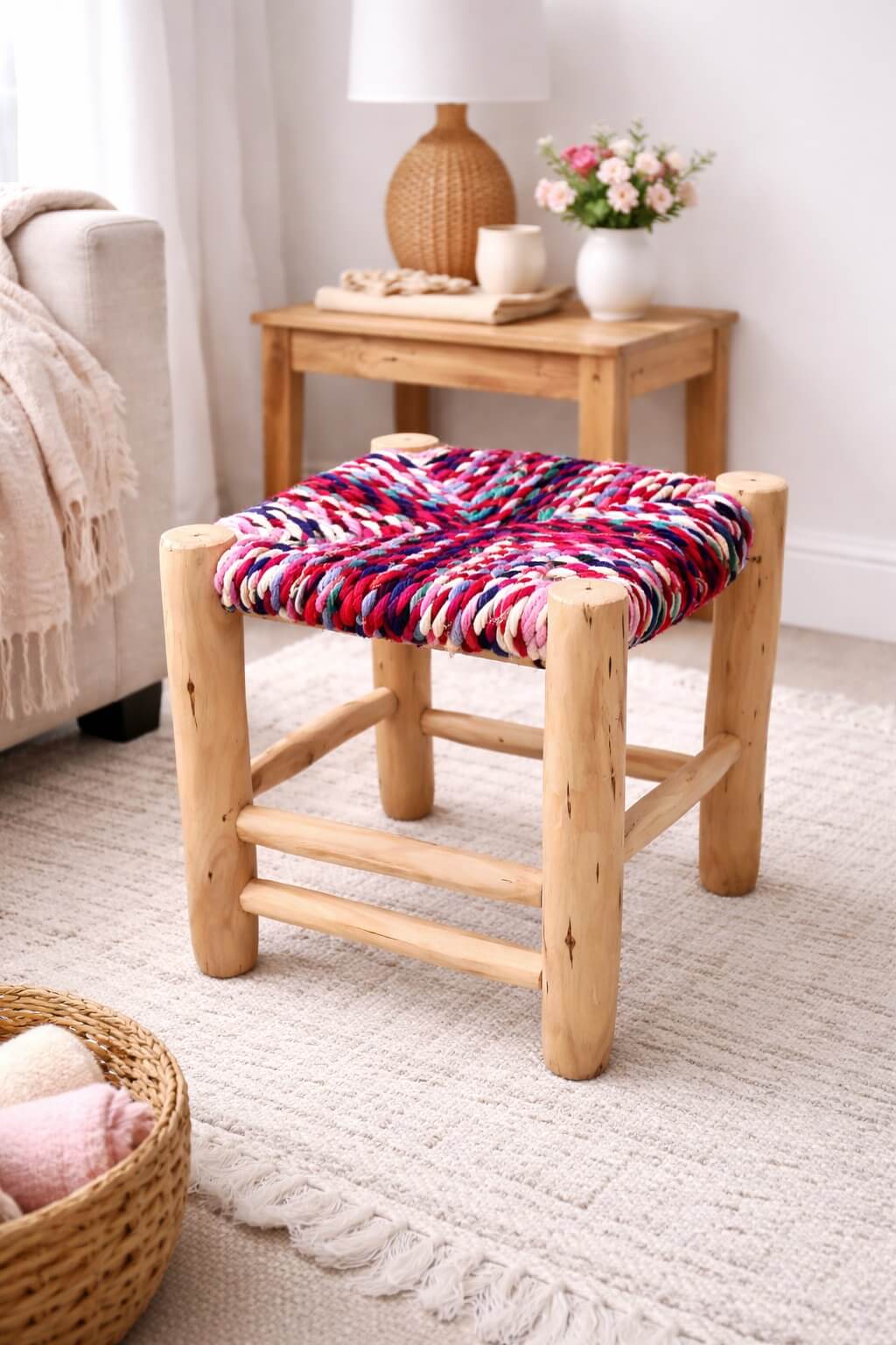 חומר: עץ טבעי עם מושב קש קלוע צבעוני צבע: שילוב גוונים צבעוניים על בסיס טבעי שימושים: ישיבה | הדום | דקורציה | פריט משלים לבית