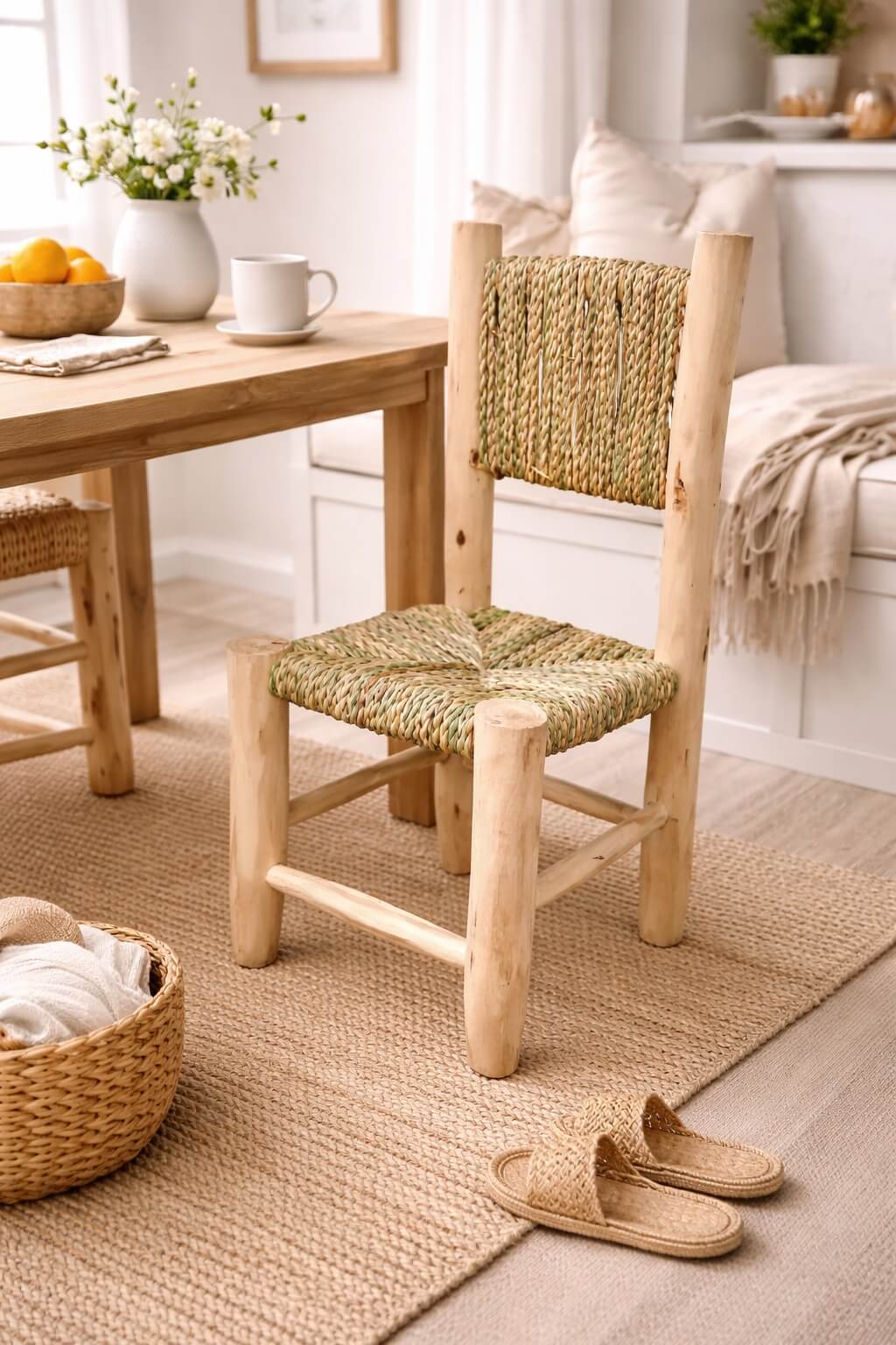 כיסא ילדים בעבודת יד, עשוי שלדת עץ טבעי עם מושב ומשענת קלועים מקש איכותי. העיצוב פשוט, יציב ומלא קסם, בגובה המותאם במיוחד לילדים, ומשלב נוחות עם מראה טבעי ובוהו-שיק.