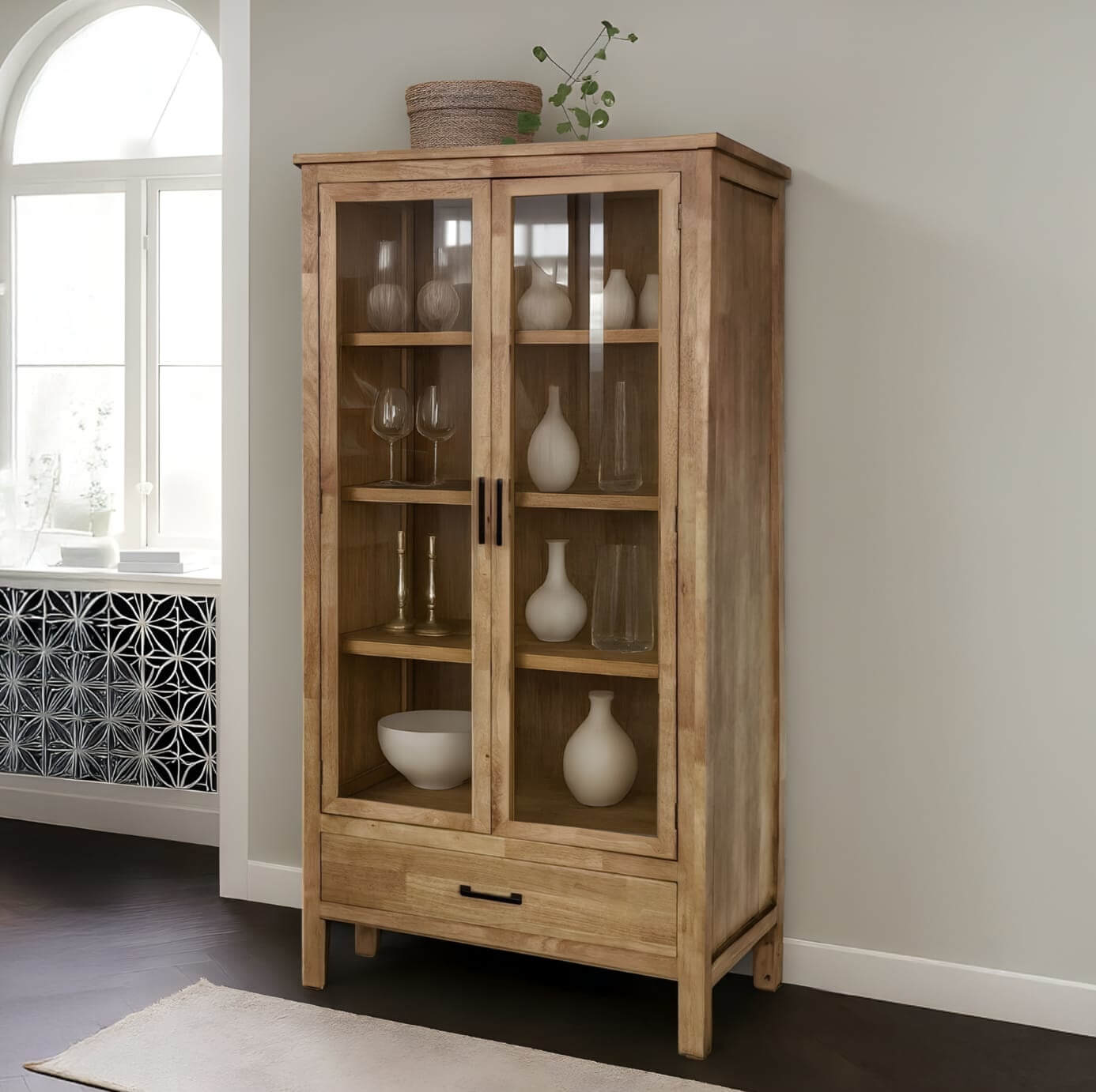 ויטרינת עץ מרהיבה בעיצוב אלגנטי ונקי, עשויה עץ טבעי איכותי בגימור חמים, עם דלתות זכוכית המאפשרות תצוגה מושלמת של כלי הגשה, כלי נוי או ספרים.