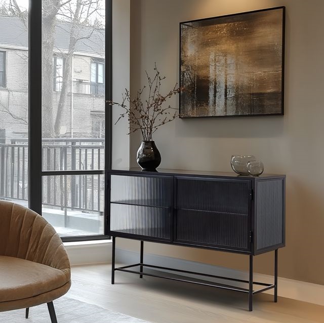 ✔ שילוב מתכת שחורה עם זכוכית מחוסמת מפוספסת ✔ רגליים גבוהות למראה קליל ומודרני ✔ דלתות זכוכית כפולות עם ידיות מינימליסטיות ✔ מושלם להצגת פריטים מעוצבים בכל חלל