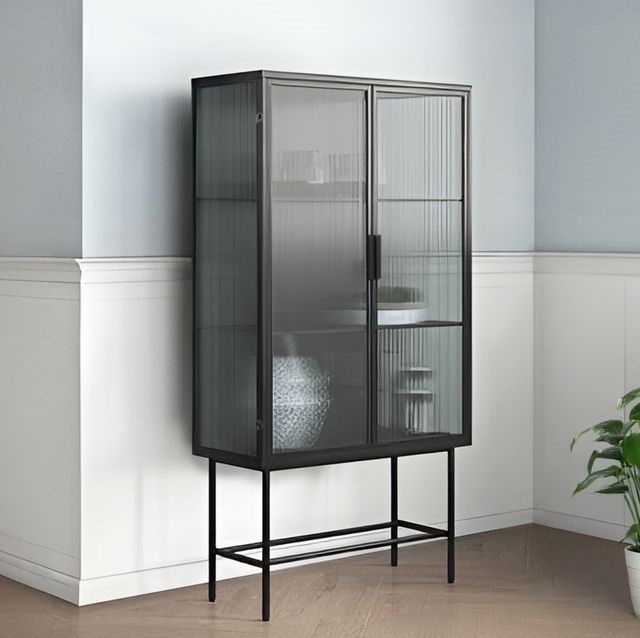 ויטרינה מרשימה ומודרנית בעיצוב נקי וייחודי, עשויה מתכת שחורה בשילוב דלתות זכוכית מפוספסת היוצרות מראה יוקרתי, אלגנטי ומעט מסתורי. הדלתות הרחבות מאפשרות הצגת פריטים באופן מסודר ואסתטי, תוך שמירה על שקיפות חלקית המוסיפה עומק וטקסטורה לחלל.