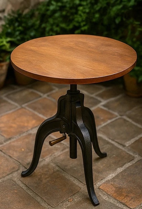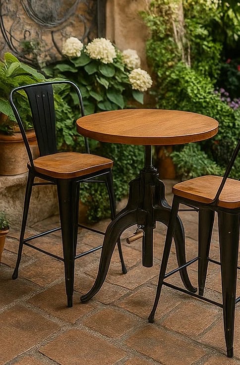 מעץ טבעי ובסיס ברזל שחור ליציבות וסגנון. שילוב מושלם של חום העץ והמתכת, אידיאלי לבתי קפה, ברים או פינות אוכל,