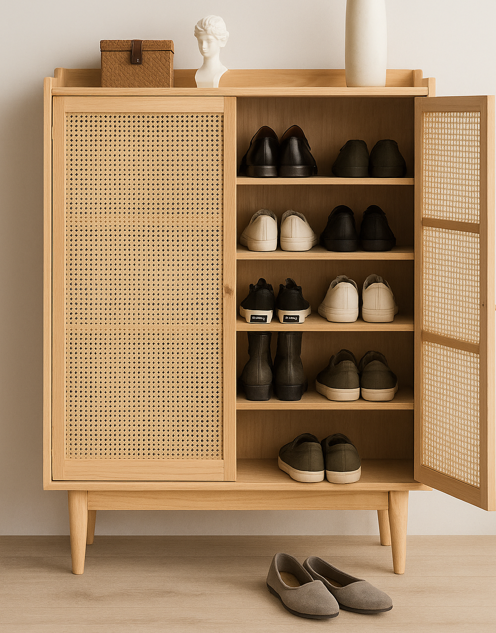 מידה:90:35:115 ארון נעליים אלגנטי ומעוצב בקו נקי, עשוי עץ טבעי בגוון חמים בשילוב דלתות ראטן קלוע בעבודת יד. הארון כולל מדפים פנימיים מרווחים לאחסון נעליים בצורה מסודרת ונגישה, עם דלת אחת נפתחת ונוספת ניתנת להזזה – לשימוש נוח ולמראה מאוורר. העיצוב המינימליסטי והטבעי משתלב בקלות בכל חלל – מבואת כניסה, חדר שינה או חדר ארונות – ומוסיף טאץ' של חמימות וסטייל לבית.