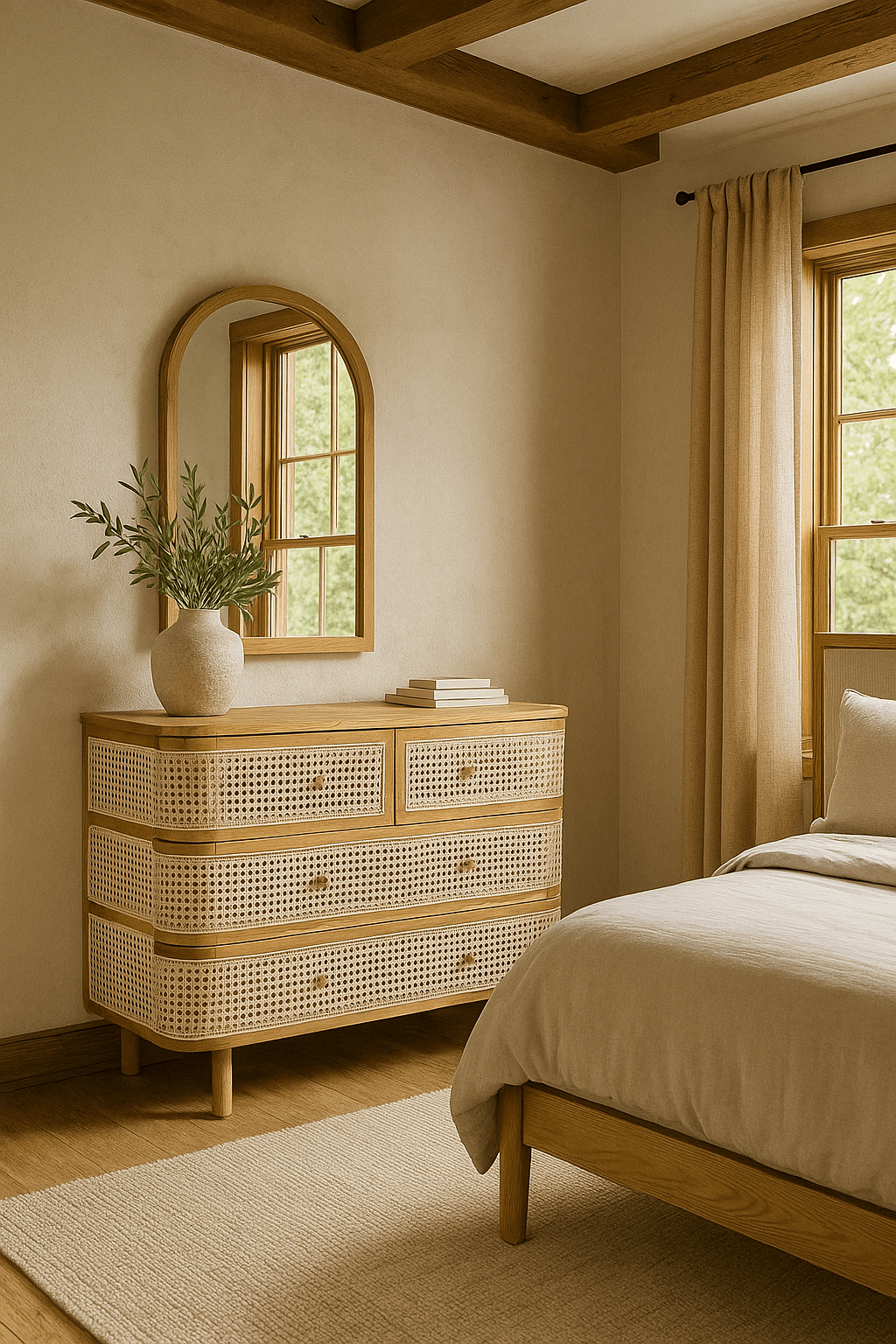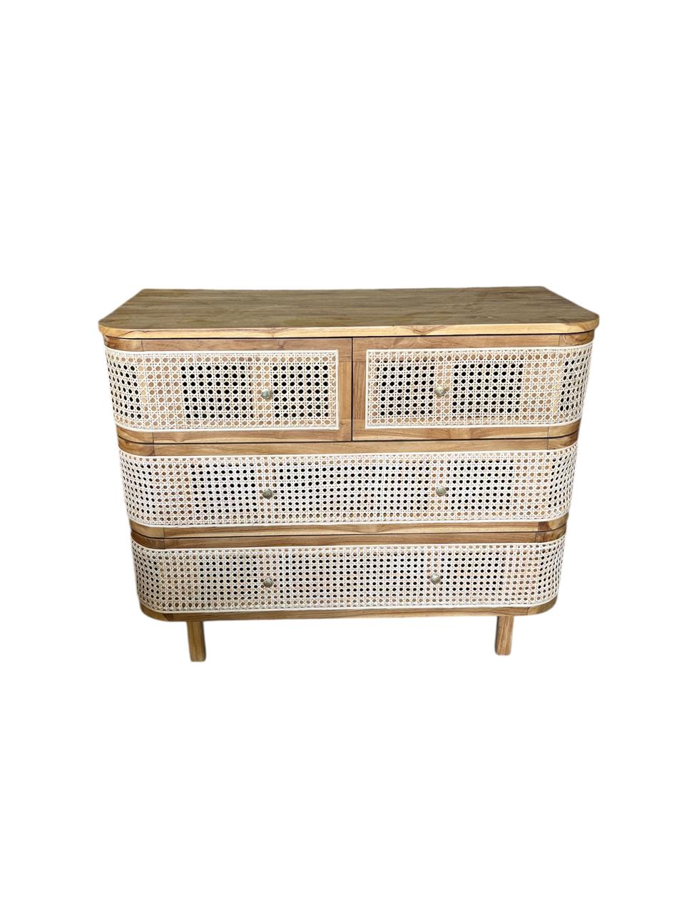 שידה מהממת בעיצוב בוהו מודרני, עשויה עץ מלא בגוון טבעי חמים עם חזיתות ראטן קלוע בעבודת יד. השילוב בין העץ הטבעי לראטן יוצר מראה רך, טבעי ומאוורר שמכניס חמימות וסטייל לחלל.