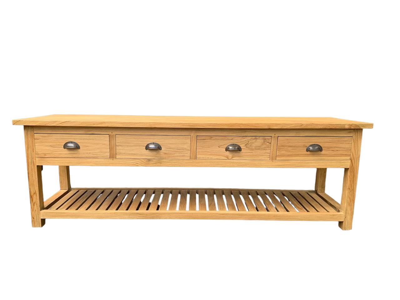 קונסולה רחבה ומרשימה עשויה עץ מלא טבעי, בעבודת יד איכותית ובגימור חמים ואלגנטי. כוללת ארבע מגירות עליונות עם ידיות מתכת כהות בסגנון וינטג’ ומדף תחתון פתוח מעץ – אידיאלי לאחסון או לתצוגה של פריטים דקורטיביים.