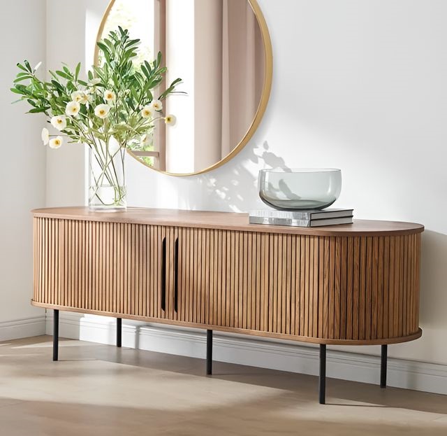 קונסולה "קינגסטון" 120 קונסולה ייחודית בעיצוב אליפטי מודרני, עשויה עץ מלא עם טקסטורה פסים אנכיים המעניקים לה מראה יוקרתי ומעודן. שילוב רגלי מתכת דקות ואלגנטיות מוסיף קלילות ותחושת אווריריות, כך שהרהיט משתלב בקלות בכל חלל עכשווי.