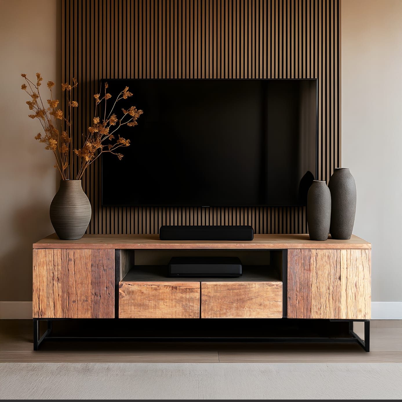 המזנון כולל שני ארונות צד רחבים, מגירות נוחות במרכז ומדף פתוח אידיאלי לממיר או למערכת קולנוע ביתית. עיצוב פונקציונלי השומר על סדר בחלל לצד נוכחות חמה ומרשימה.