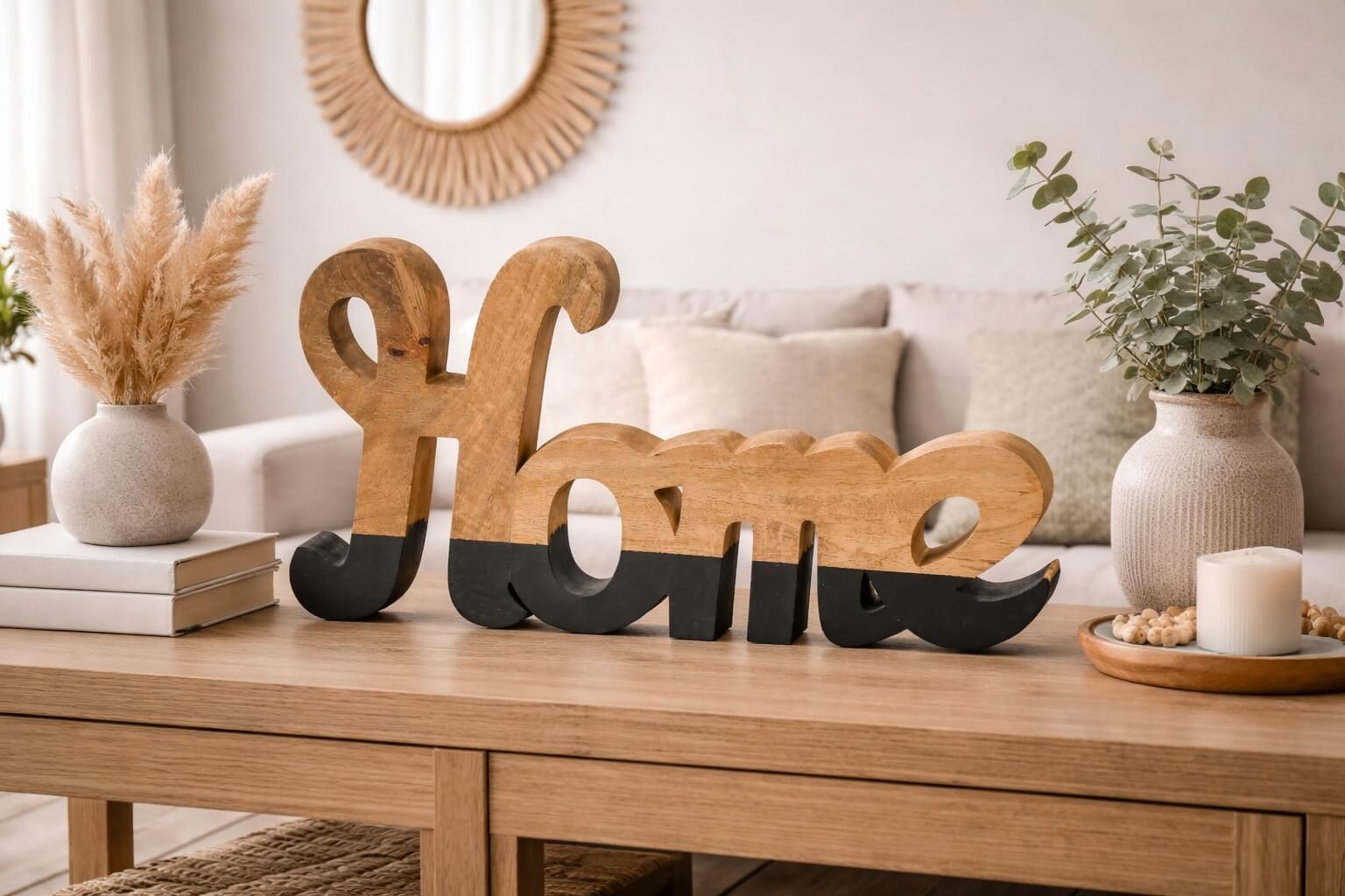 שלט דקורטיבי מרשים עשוי עץ מלא, בעיצוב אותיות תלת־ממדיות עם מראה טבעי וחמים. השלט מעניק תחושת ביתיות, רוגע ואווירה מזמינה, ומתאים להנחה על מדף, שידה, קונסולה או בכניסה לבית. כל פריט ייחודי  בזכות  טקסטורת העץ והגימור הטבעי.