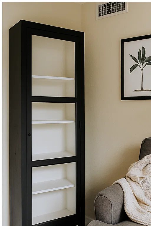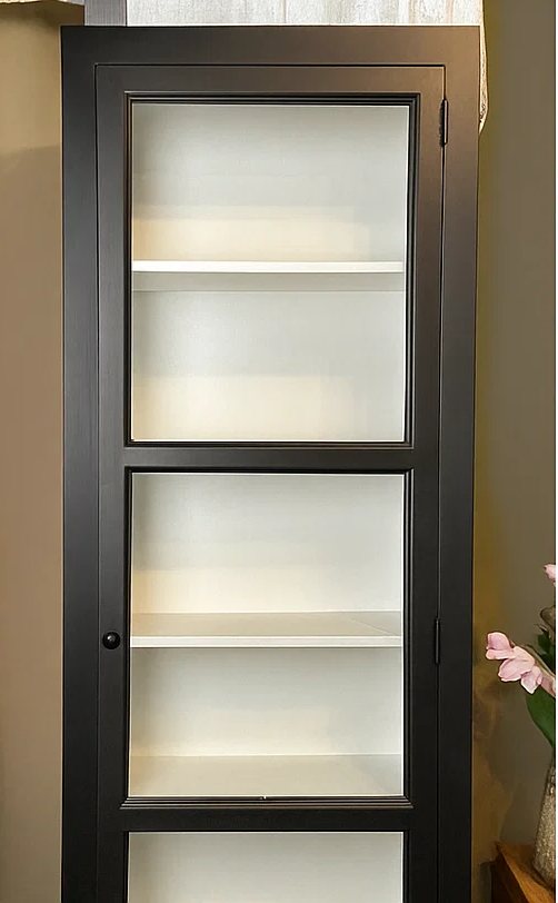 שתי דלתות עם חלונות זכוכית ומספר מדפים לשימוש מגוון.
