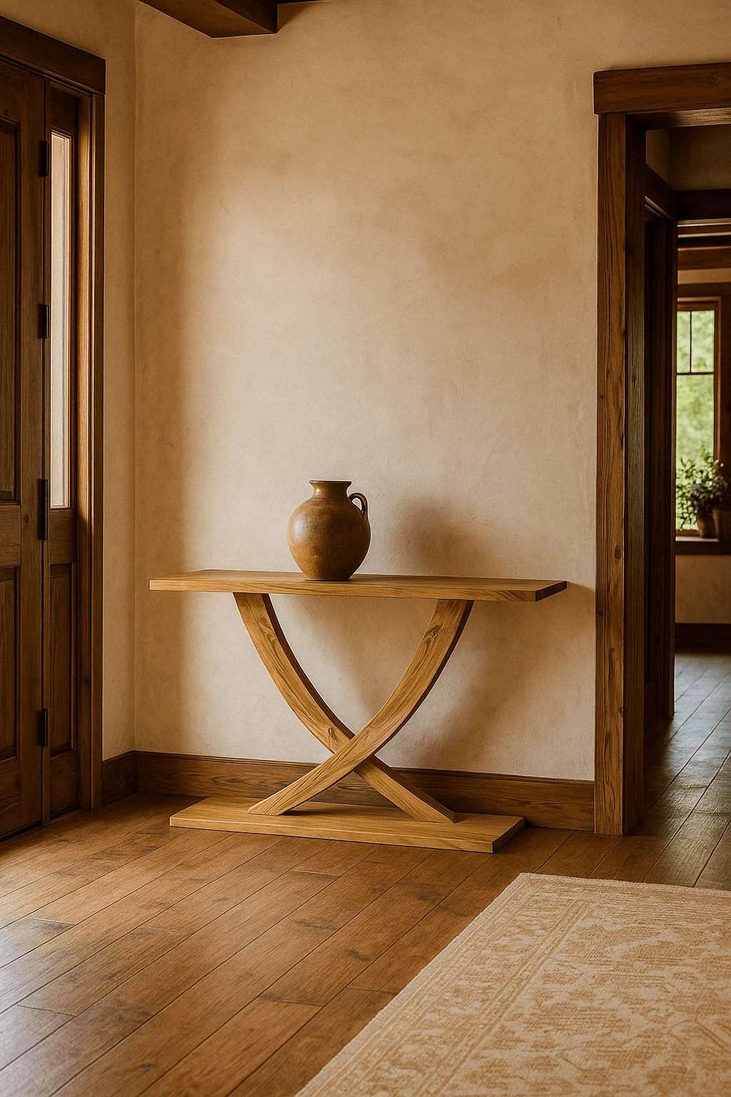 העיצוב הכפרי-מודרני משתלב בצורה מושלמת בכל חלל – מבואת כניסה, סלון או פינת אוכל – ומוסיף לבית מגע של טבע ועבודת נגרות אמנותית.