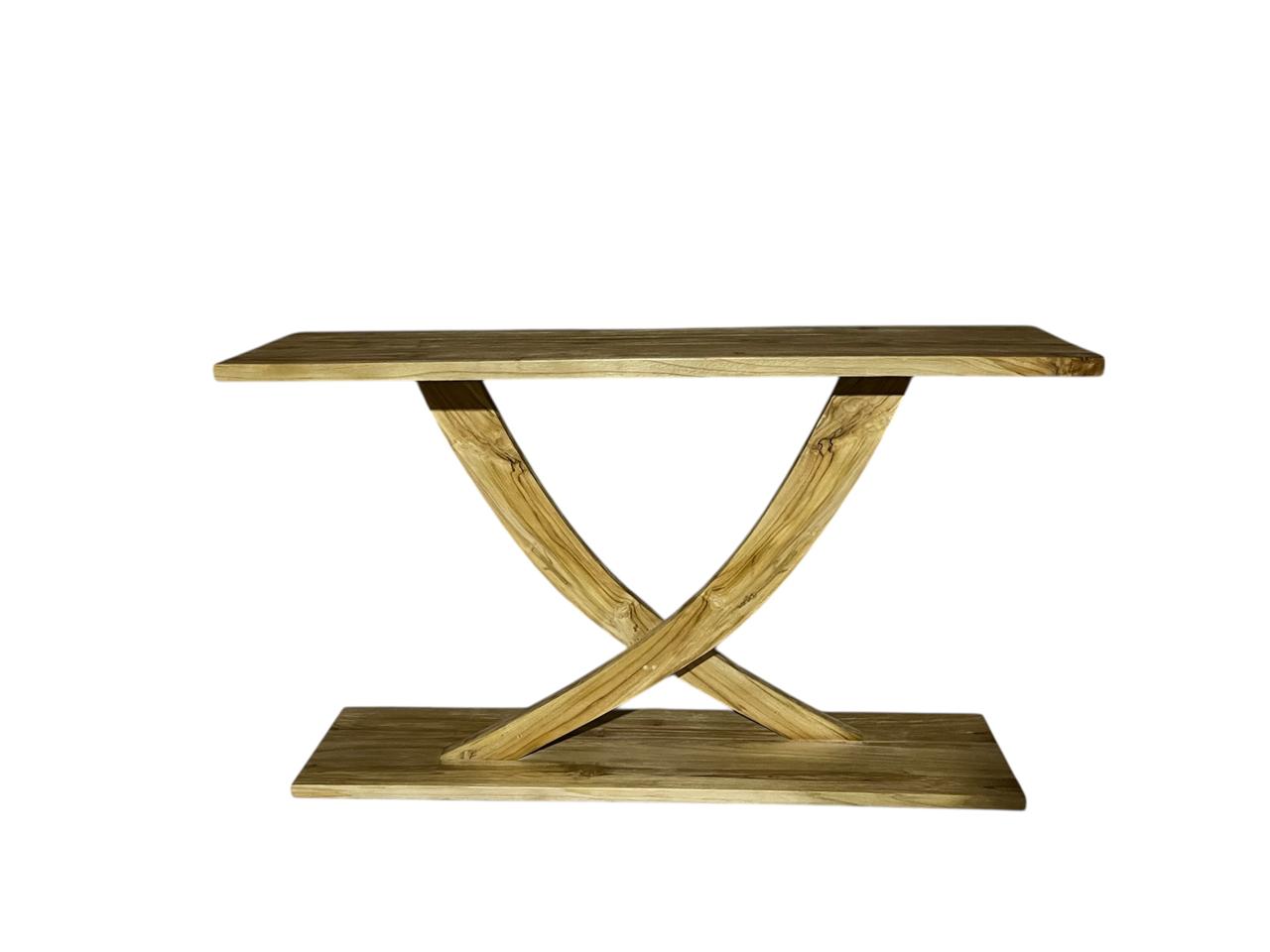 מידה:140:35:82 קונסולה מרהיבה בעבודת יד מעץ מלא טבעי, בעלת רגליים בצורת X המעניקות לה מראה ייחודי, אלגנטי ויציב. משטח העץ הרחב והטקסטורה הטבעית של החומר יוצרים תחושת חמימות, טבע ויוקרה אמיתית.