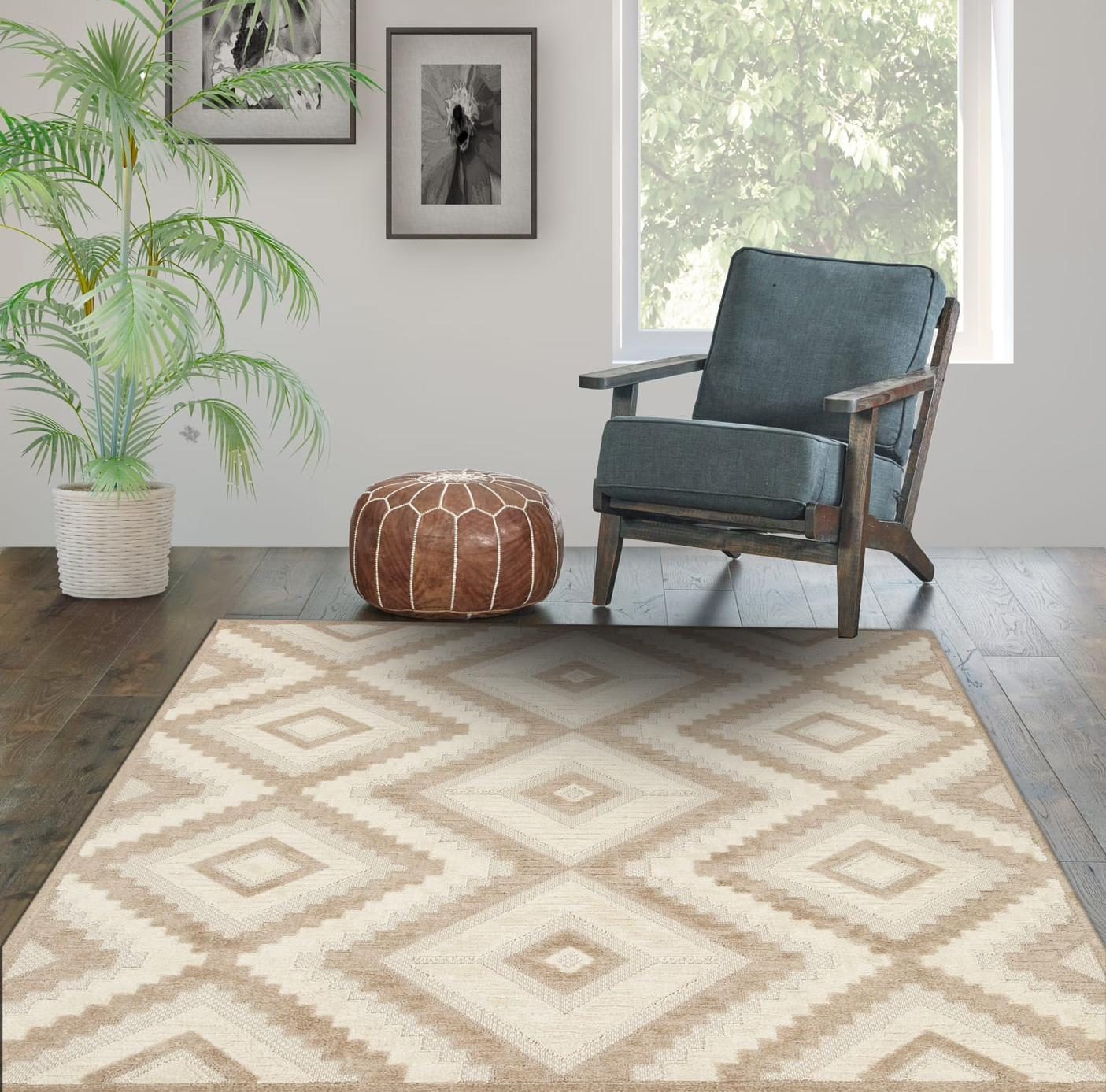 שטיח מודרני בעיצוב גיאומטרי מרהיב, בגווני בז' וחול טבעיים היוצרים מראה חמים ונקי. הדוגמה היהלומית מעניקה תחושת עומק ועיצוב אלגנטי שמתאים כמעט לכל חלל – מסלון ופינת אוכל ועד חדר שינה.