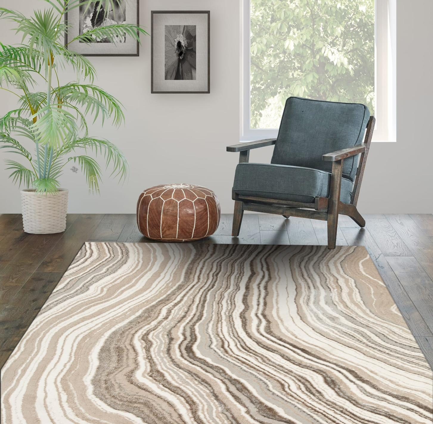 שטיח מודרני מרהיב בעיצוב ייחודי המזכיר טקסטורת אבן טבעית בגווני בז' וחום. הדוגמה הגלית מוסיפה תחושת תנועה ודינמיות לחלל, תוך שמירה על מראה אלגנטי וחמים המשתלב בקלות עם מגוון סגנונות עיצוב – מודרני, סקנדינבי או כפרי.