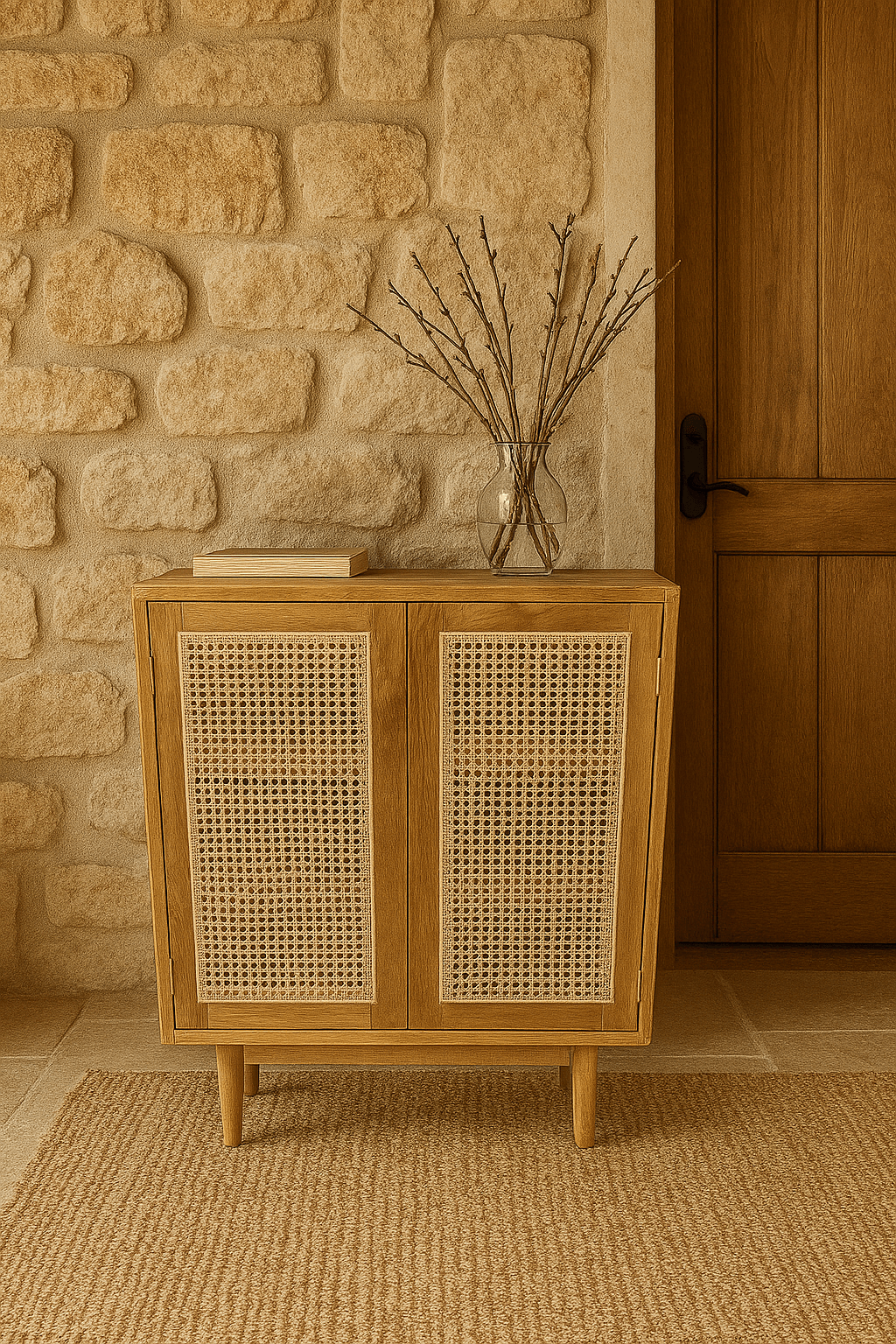 ארון נעליים אלגנטי ומעוצב בקו נקי, עשוי עץ טיק טבעי בגוון חמים בשילוב דלתות ראטן קלוע בעבודת יד. הארון כולל מדפים פנימיים מרווחים לאחסון נעליים בצורה מסודרת ונגישה, עם דלת אחת נפתחת ונוספת ניתנת להזזה – לשימוש נוח ולמראה מאוורר.