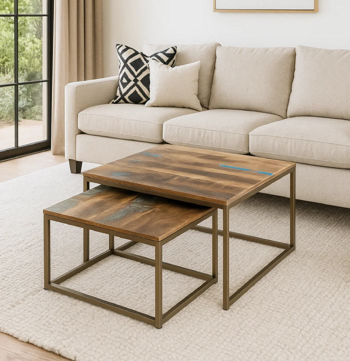 סט שולחנות דגם בארי. סט שולחנות סלון מרובעים מעץ טבעי עם רגלי נחושת. עיצוב מודרני ופונקציונלי שמוסיף חמימות וסטייל לכל חלל.