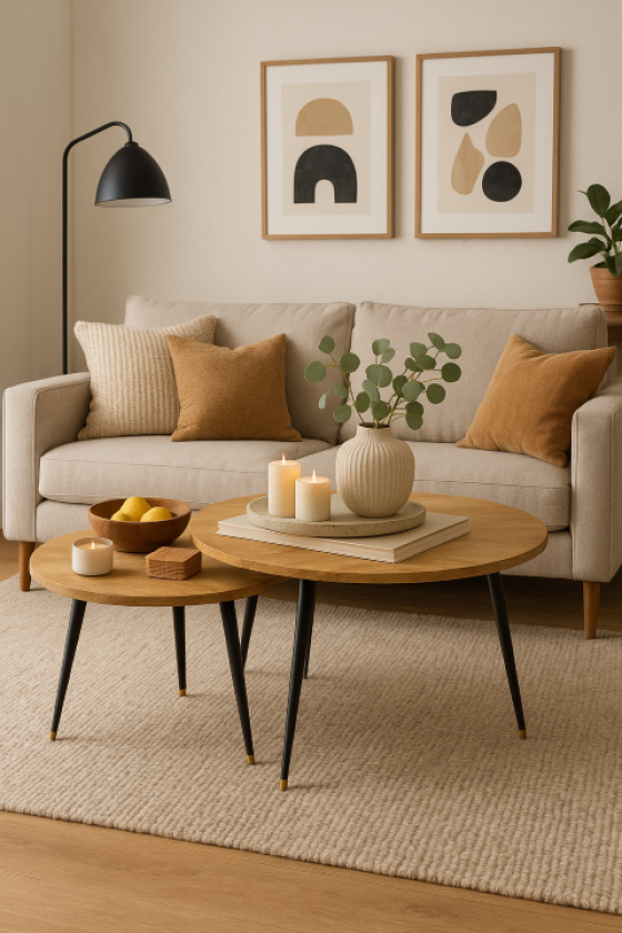 סט שולחנות דגם נופר. סט שולחנות סלון עגולים מעץ טבעי עם רגלי מתכת שחורות. עיצוב מודרני ופונקציונלי שמוסיף חמימות וסטייל לכל חלל.