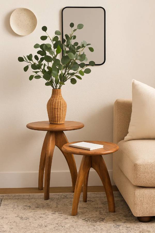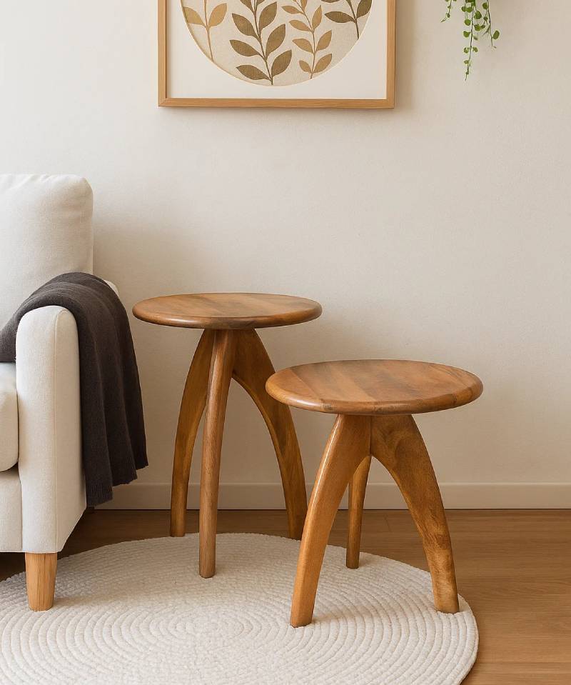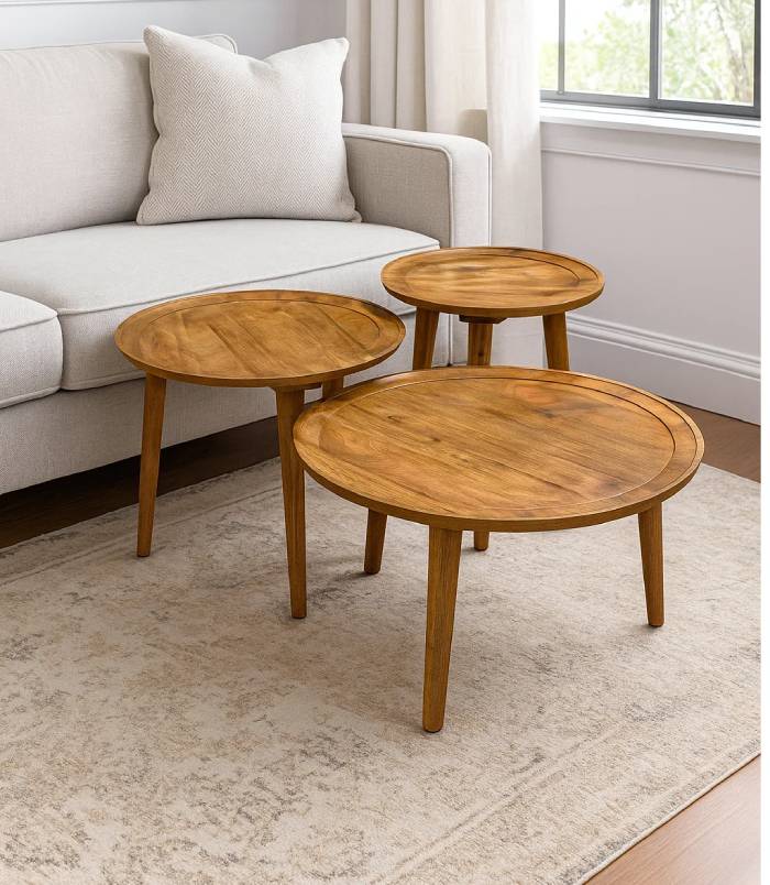 סט שולחנות דגם כמון. סט שולחנות סלון עגולים עשוי עץ בגוון חם. השולחנות מגיעים בשלושה גדלים משתלבים, נוחים לשימוש יומיומי ומוסיפים חמימות ואופי לכל חלל.