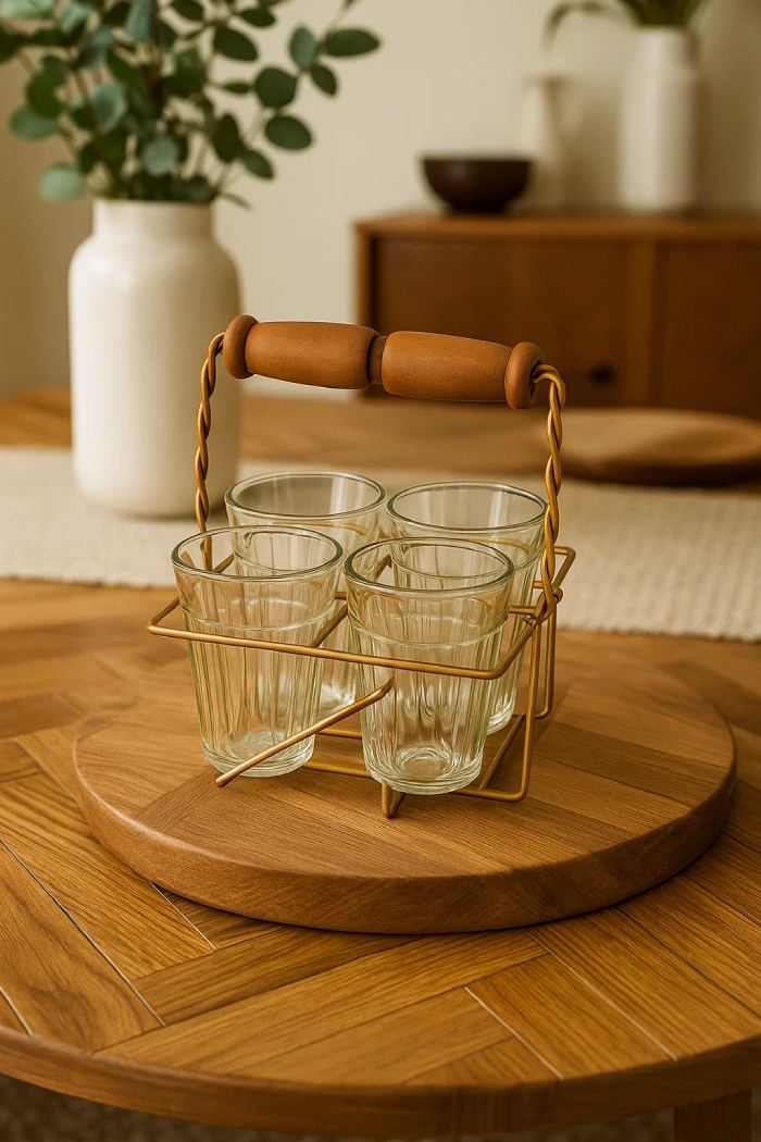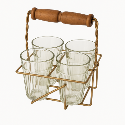 מעמד כוסות רביעייה דגם סתיו. מעמד כוסות מעוצב עשוי נחושת עם ידית עץ. פתרון אלגנטי ושימושי להגשה ואירוח עם נגיעה כפרית-יוקרתית.